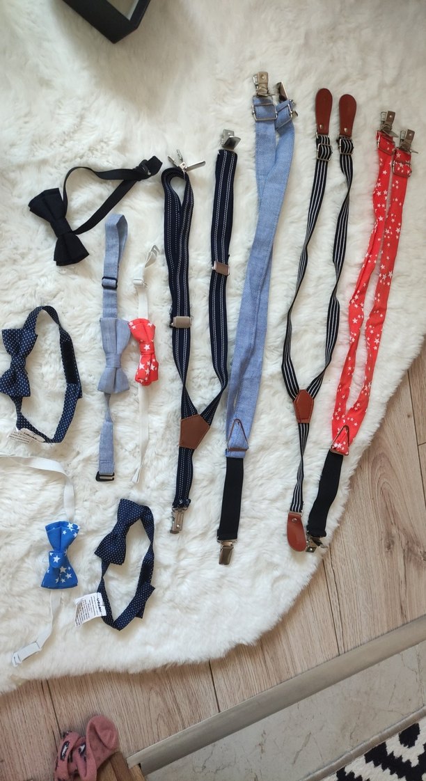 Çocuklar için tokalı, tekstil malzemeden çok renkli askı ve papyon seti. Koyu tonlarda, desenli ve desensiz modellerle karşıt kültür tarzında şık bir görünüm sunar. tek tek satiliktir