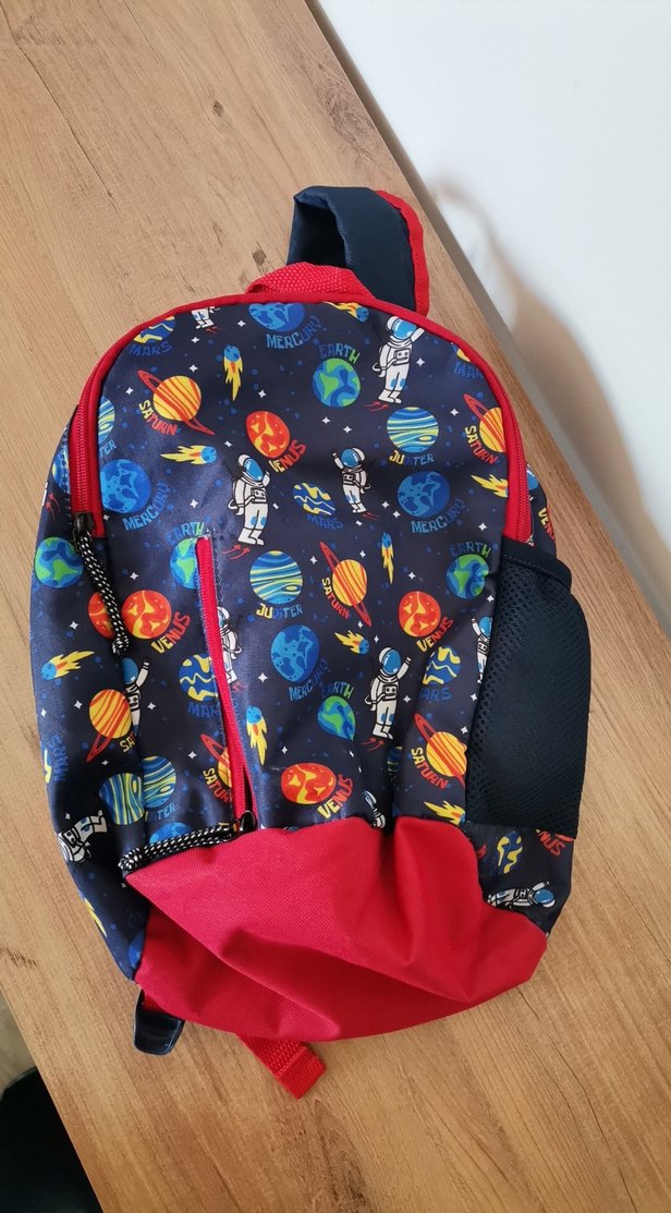 Çok renkli gezegenler, astronotlar ve roketler desenli koyu mavi çocuk anaokulu çantası. Ön fermuarlı cep ve file yan cep bulunur.