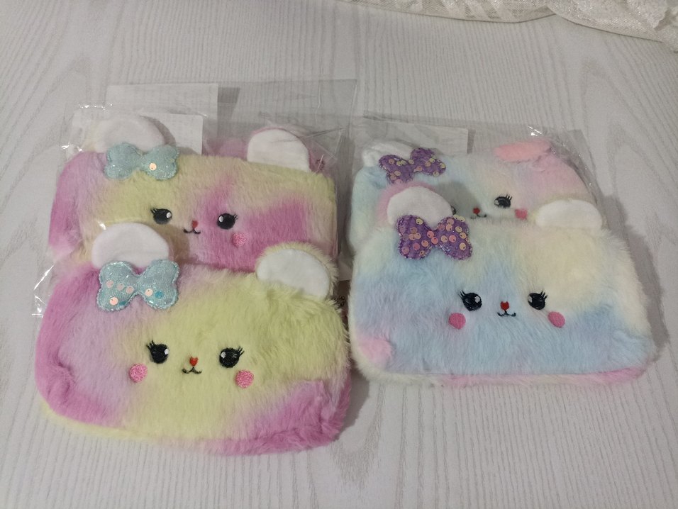 Yumuşak peluş malzemeden yapılmış, pastel tonlarda çok renkli tie-dye desenli çocuk yastıkları. Her yastık sevimli işlemeli yüzler ve süslü fiyonklar içerir.