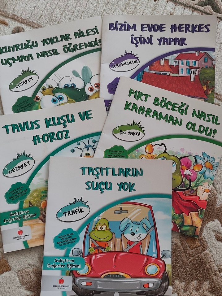 Sorumluluk, cesaret, nezaket ve trafik güvenliği gibi değerleri anlatan renkli resimli çocuk kitapları seti. Okulöncesi ve ilkokul 1 için uygundur. yeni gibidir.