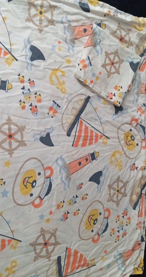 Çocuklar için yumuşak sentetik kumaştan yapılmış, ayılar, gemiler, çapa ve deniz fenerleri desenli, hafif çok renkli baskılı uyku tekstili. içinde çarşaf hiç kullanılnadı ama lekeli çıkmıştı hediye geldiği için değiştirememiştim kaldı öyle hiç kullanılmadı