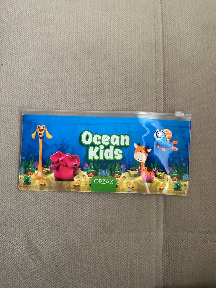 Renkli, deniz temalı baskılı çocuk kalemlik kolay kullanım için Ocean Kids' ve 'ORZAX' yazılıdır.