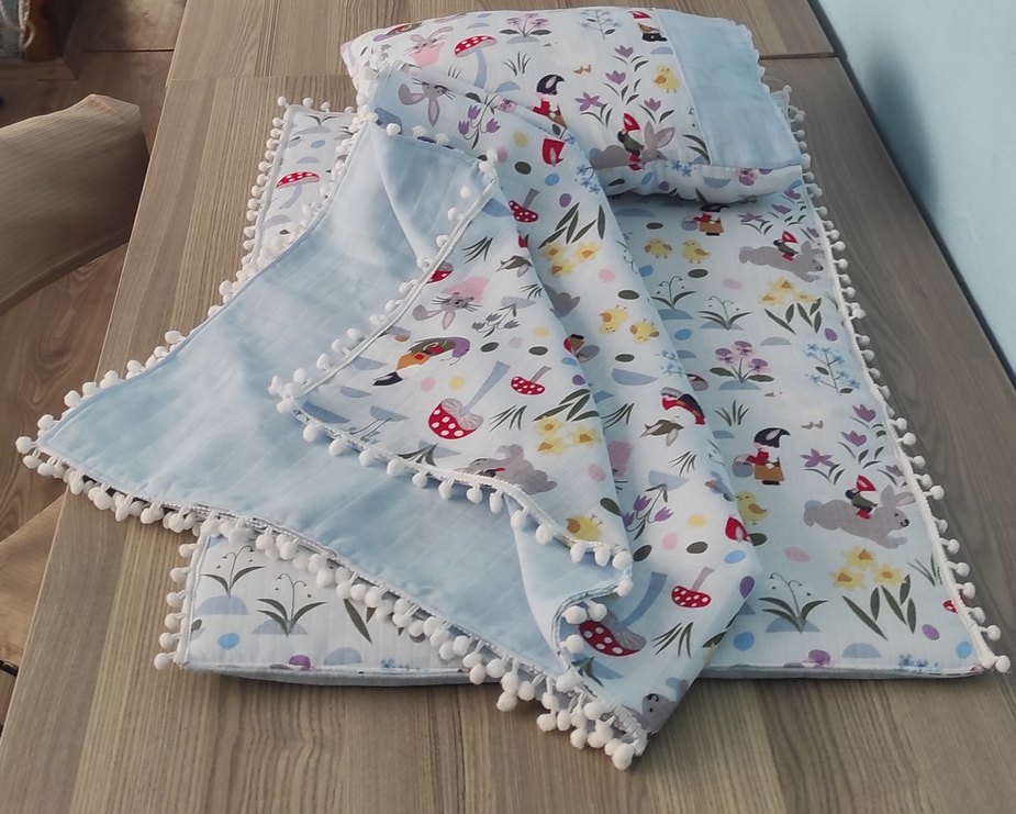 Kendi diktiğim el emeği sıfır ürün %100 organik pamuklu yumuşacık sıcacık saran Müslin kumaştan dikildi 100 x 100 cm. çift taraflı Battaniye, alt açma minderi ve boncuk elyaf dolgulu yastık battaniyeli uyku seti. ️