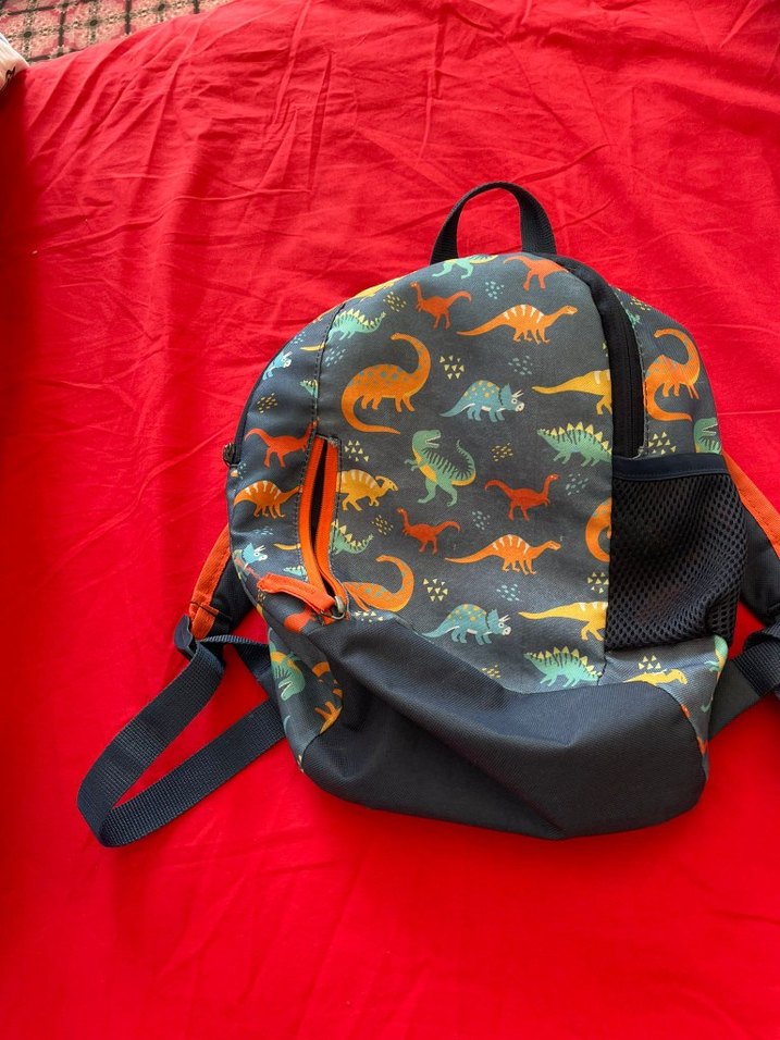 Çocuklar için koyu renkli, renkli dinozor desenli okul çantası. Ayarlanabilir askılar ve yan file cep bulunur.