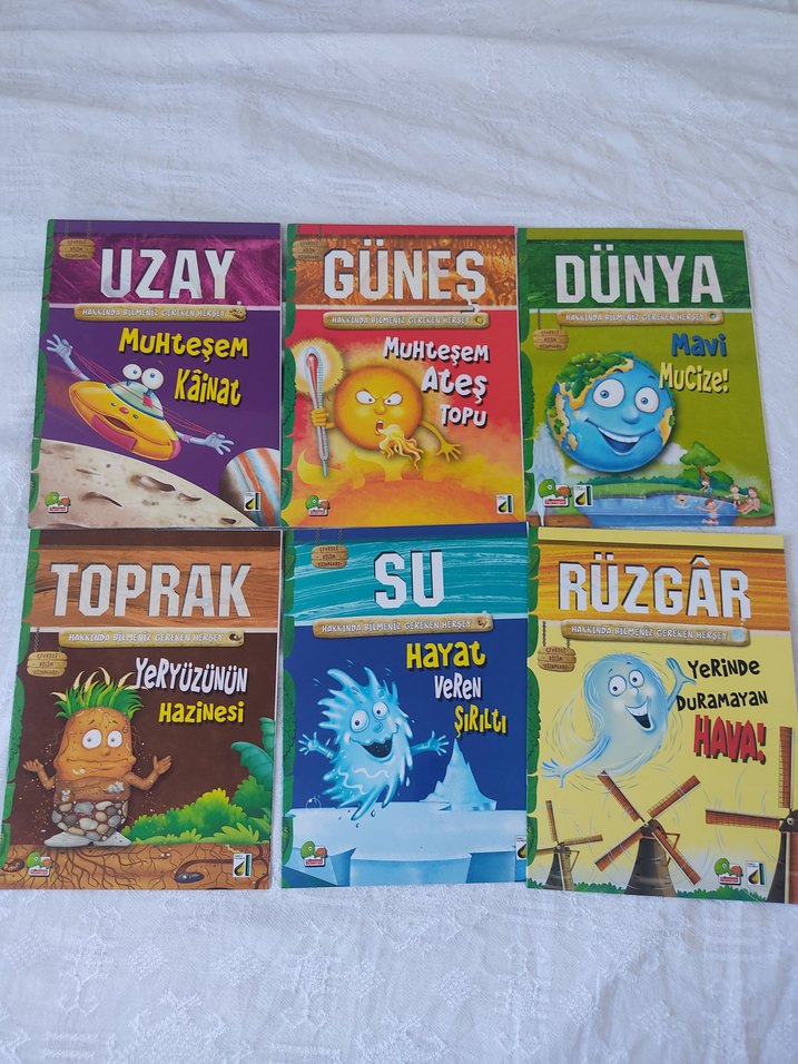 Toprak, dünya, ateş, uzay, rüzgar, su ve güneş konularını eğlenceli çizimlerle anlatan çocuk kitapları seti.