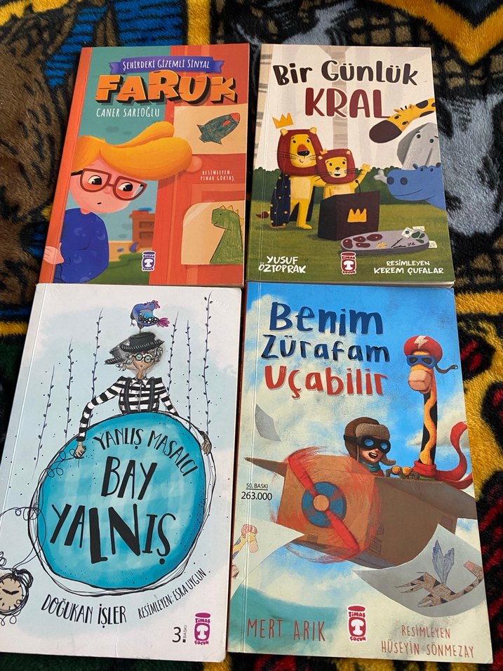 Caner Sarıoğlu'nun 'Faruk', Yusuf Öztoprak'ın 'Bir Günlük Kral', Yalnıs'ın 'Bay Yanlış' ve Mert Arık'ın 'Benim Zürafam Uçabilir' kitaplarından oluşan çocuk kitabı seti.