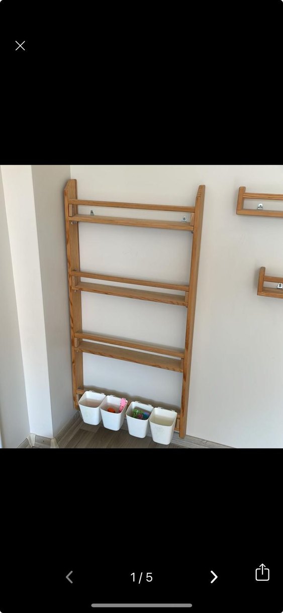 Açık bej renginde, duvara monte edilmiş üç yatay çubuğu olan ve çocuklar için iki ahşap raf. ( demonte paket halindedir.)