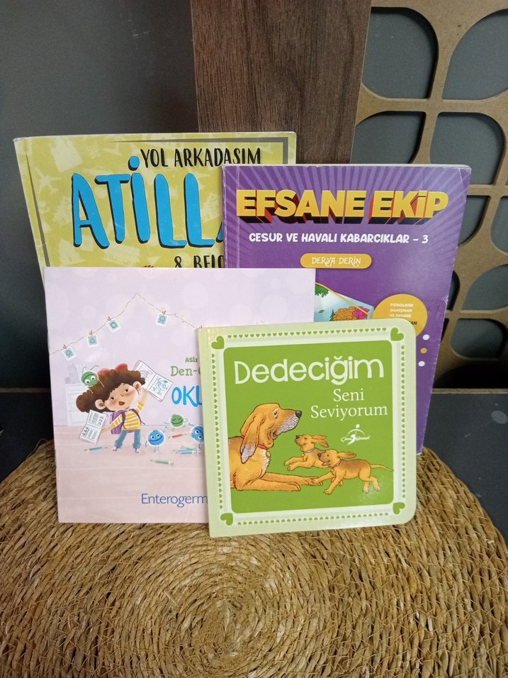 'Dedeciğim Seni Seviyorum' ve 'Yol Arkadaşım Atilla' gibi kitapları içeren çocuklar için eğlenceli ve öğretici kitap seti. 4 adet ilköğretim okuma kitapları