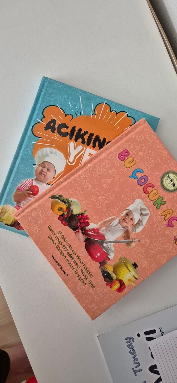 Renkli kapaklı, iki yemek temalı bebek ek gıda kitabı.