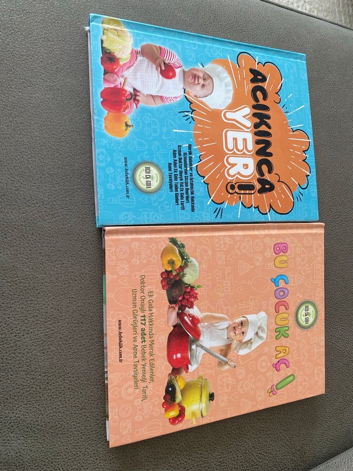Çocuklar için yemek ve beslenme konulu, renkli kapakları ve eğlenceli içerikleriyle sağlıklı beslenmeyi öğreten iki kitap.