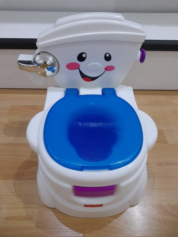 Gülümseyen yüz tasarımı ve mavi kapağı olan, çocuklar için eğlenceli tuvalet eğitimi oturağıdır. (Ürünün ses aparatı ve erkek cocuk için olan yeşil aparatı yoktur.)