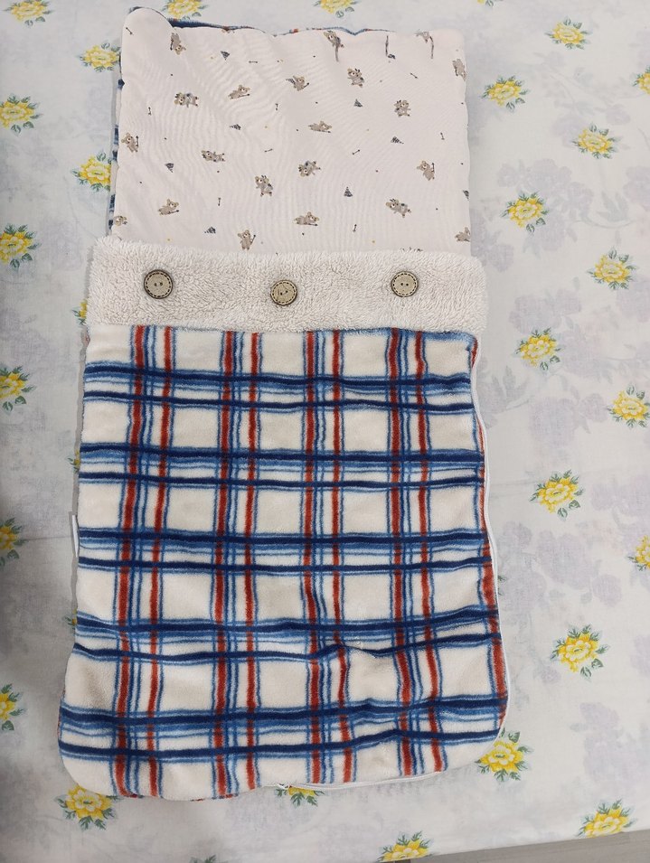 Çocuklar için yumuşak ve sıcak kumaştan, mavi-kırmızı ekose desenli ve düğme detaylı battaniye.