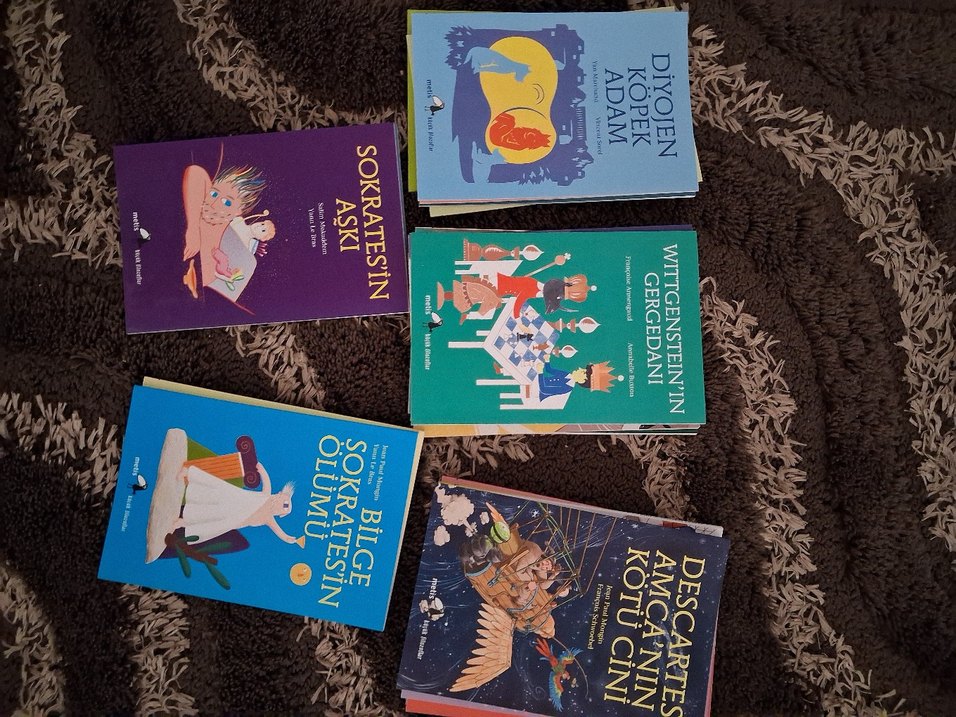 "Diogen Köpek Adam", "Wittgenstein'in Gergedanı", "Sokrates'in Aşkı", "Sokrates'in Ölümü" ve "Descartes Amcanın Kötü Cini" gibi felsefi hikayeler içeren çocuk kitapları seti. küçük filozoflar metis