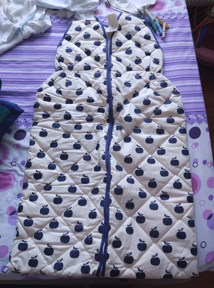 Yumuşak sentetik kumaştan yapılmış, fermuarlı beyaz pastel renkli çocuk uyku tulumu. Üzerinde küçük elma desenleri bulunur. ölçüsü 100 cm sıfır fermuarlıdır