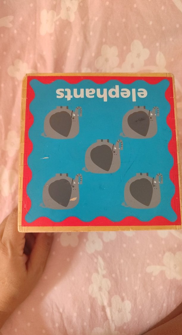 Turkuaz zemin üzerinde gri fil resimleri bulunan ahşap çocuk puzzle'ı, problem çözme ve el-göz koordinasyonunu geliştirir. sadece kalem çizgileri var