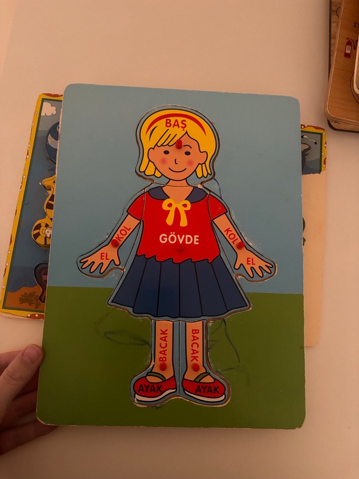 Renkli puzzle, çocuklara Türkçe vücut parçalarının isimlerini öğretir. Baş, kol, bacak gibi bölümler etiketlidir.