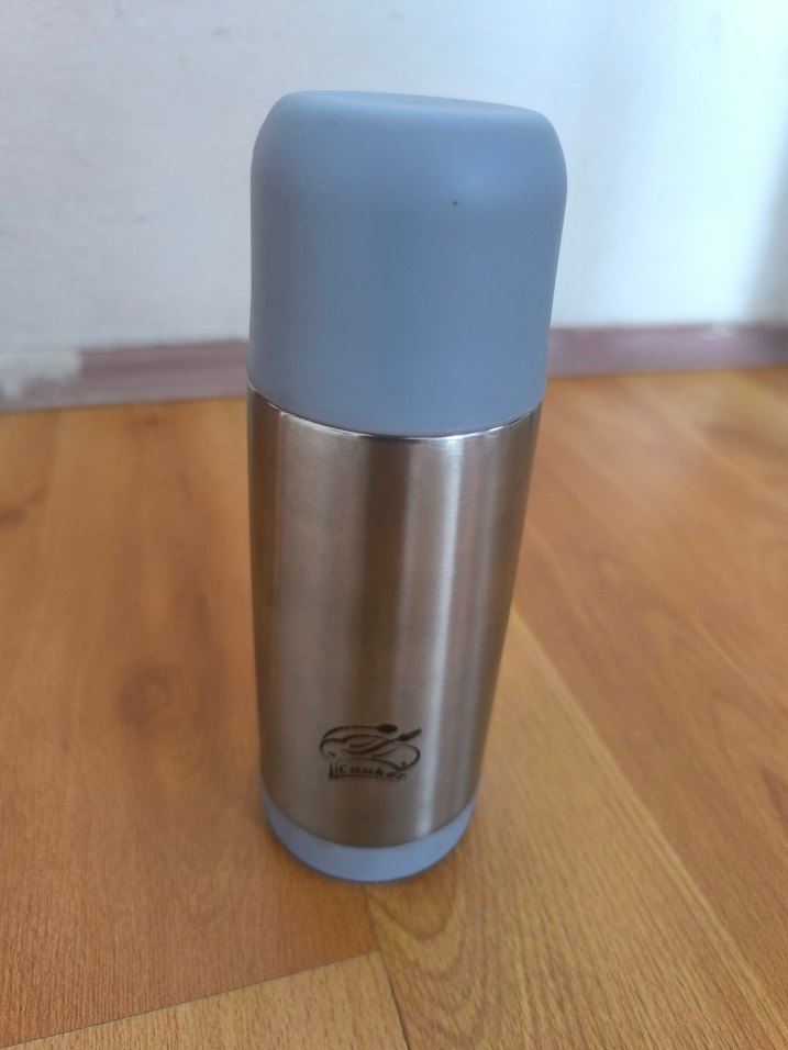 Çelik gövde ve gri kapaklı çocuk termosudur, içecekleri sıcak tutmaya uygundur. Dayanıklı ve sade tasarıma sahiptir.