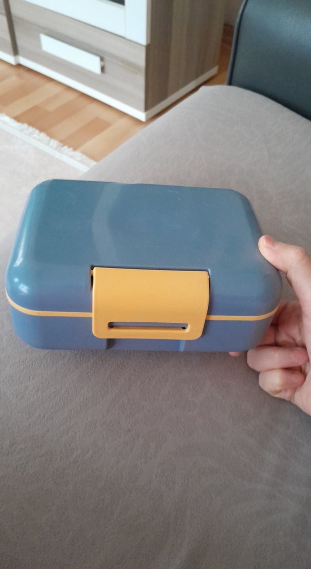 Sarı ve gri renklerde, sarı kilitli çocuk yemek seti; tabak, çatal ve kaşık içerir, taşıması kolaydır. ️