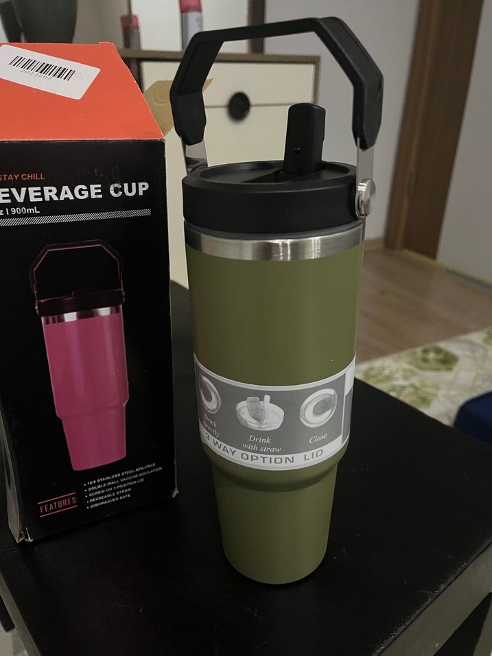 Haki renkte, sağlam saplı ve güvenli kapaklı çocuk termos bardağı. İçeceklerin sıcaklığını korur. ☕