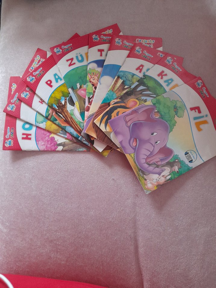 Renkli hayvan çizimleri ve basit hikayeler içeren çocuklar için kitap seti.