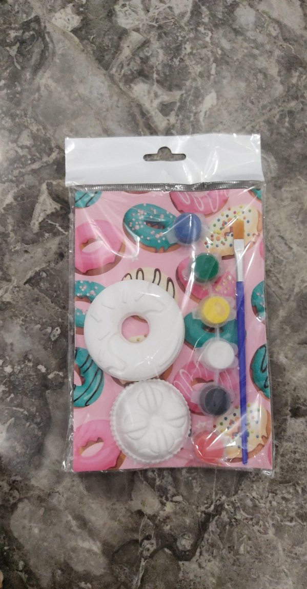 Pastel renklerde boyalar, fırça ve boyanacak iki beyaz figür içeren çocuk boyama seti, renkli donut desenli arka planla paketlenmiştir 2 adet taş figür , 6lı boya 1 adet fırça evde çocukların yetişkinlerin kaliteli vakit gecireceği hobi seti