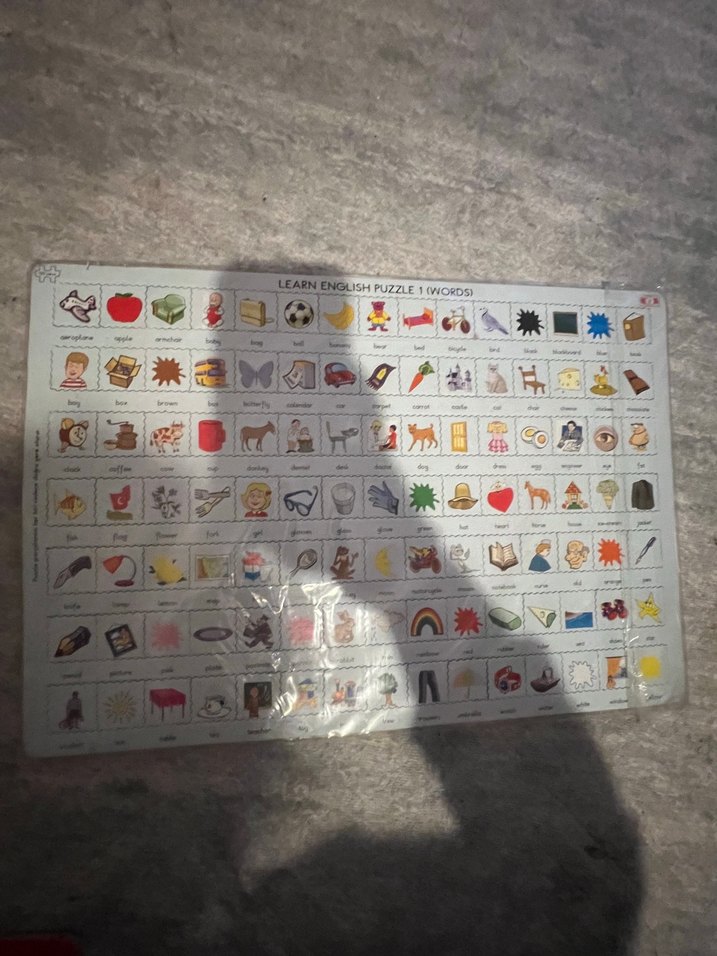 Renkli çocuk puzzle'ı, İngilizce kelimeleri resimli kartlarla öğrenmeye yardımcı olur. Farklı nesne ve hayvanlar içerir. Bir süredir evde bekliyordu hiç kullanılmadı parçaları tamdır
