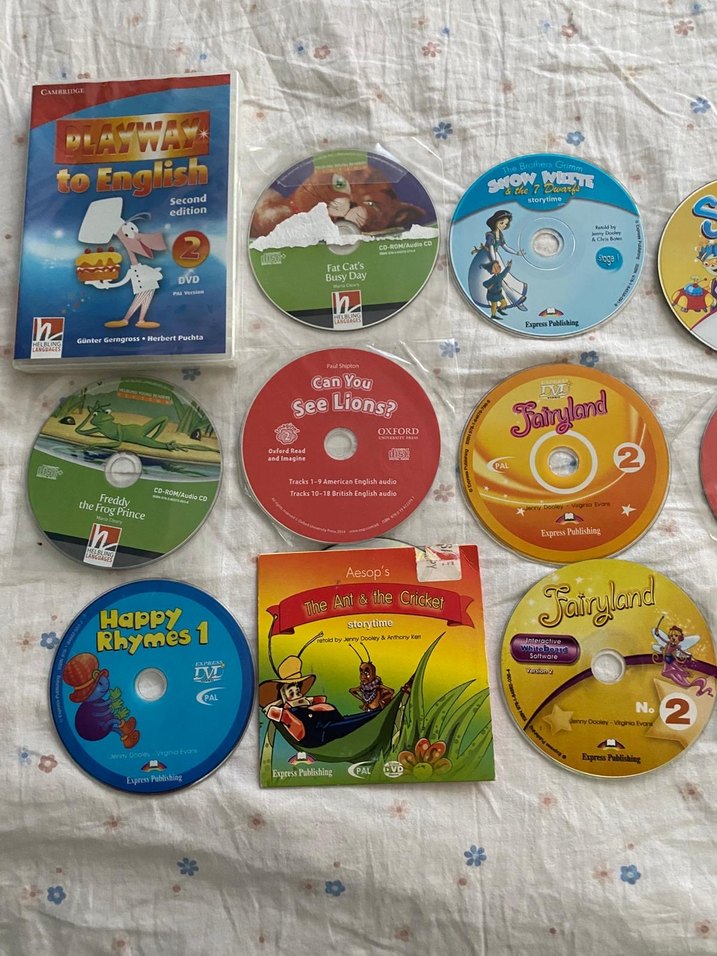 İngilizce öğrenme, tekerlemeler ve masallar içeren çocuklar için eğitim ve hikaye CD seti. Renkli disklerde 'Happy Rhymes 1', 'Can You See Lions?' ve 'Fairyland' gibi başlıklar bulunur.