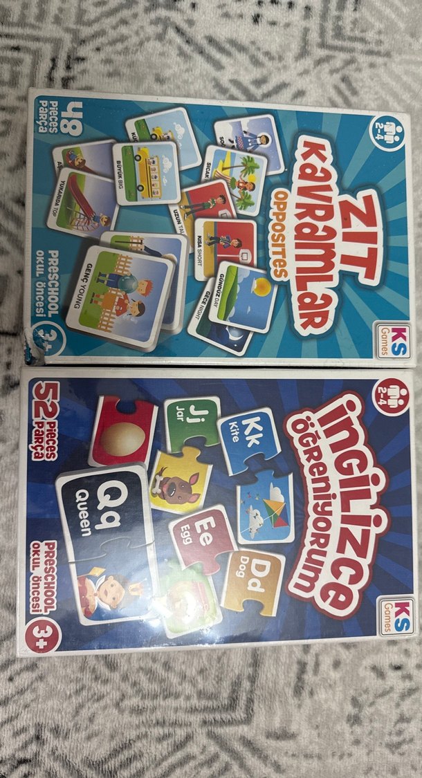 Ikiside jelatinli ve hiç açılmamıştır sadece birisinin köşesi deforme olmuştur. Okul öncesi çocuklar için renkli ve eğitici iki puzzle seti. Biri zıt kavramları, diğeri İngilizce kelimeleri öğretir. 3 yaş ve üzeri için uygundur. İKİLİ FİYATIDIR.