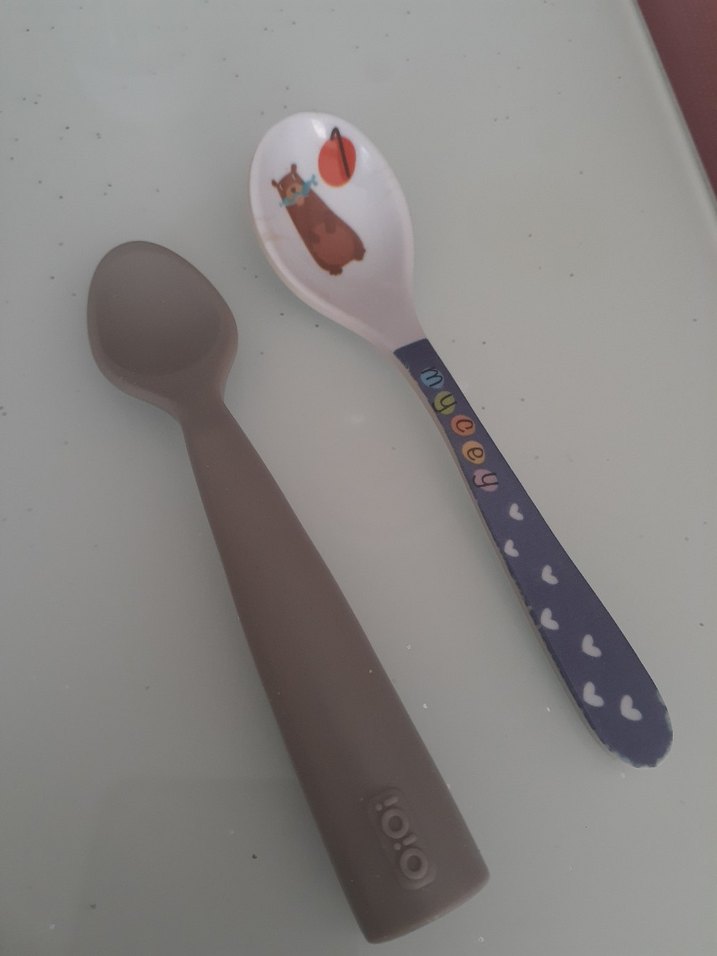 Bu sette biri kahverengi düz, diğeri mavi saplı ve kalp desenli, kaşık kısmında tilki figürü bulunan iki çocuk kaşığı yer alır.