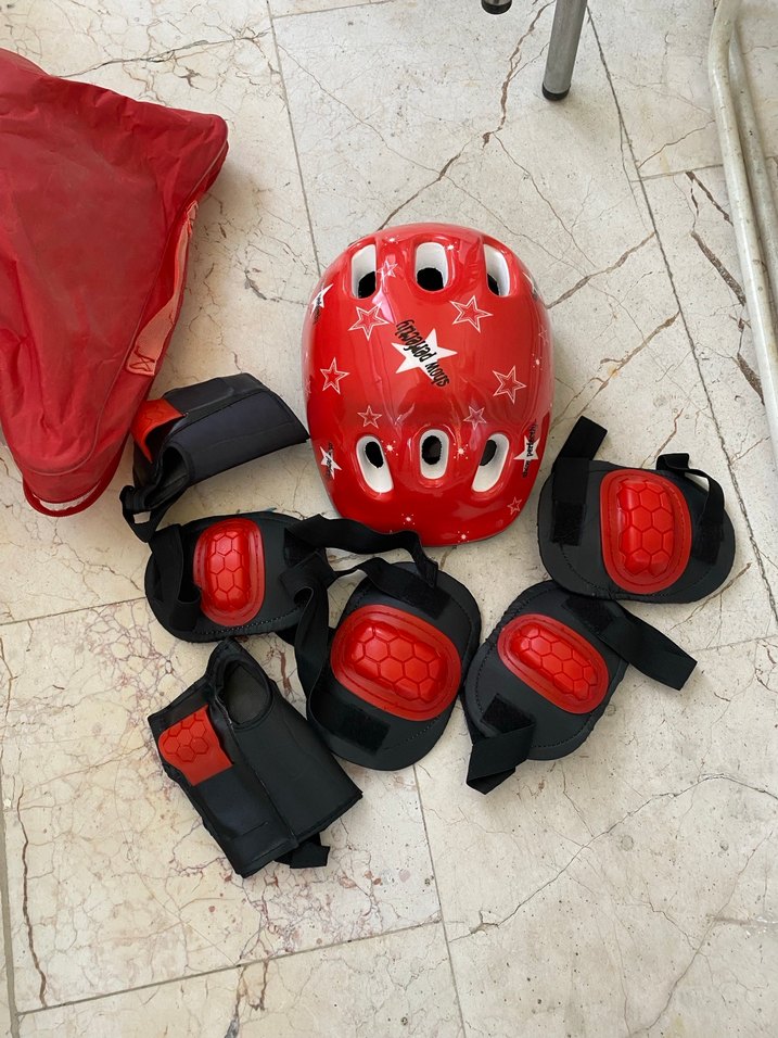 Renkli kırmızı koruyucu set, baskılı desenli kask ve cırt cırtlı bantlarla tam oturuş sağlar. Dayanıklı plastikten yapılmıştır.