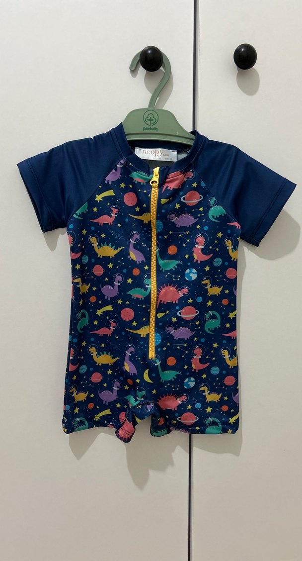 Kısa kollu, renkli dinozor desenli çocuk mayo, önde fermuarlı ve rahat yüzme kumaşından üretilmiştir. 9-12 ay. 2-3 kez kullanıldı.