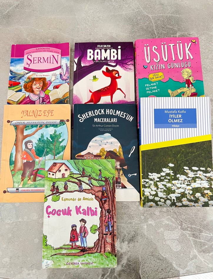 Bambi, Üşütük ve Sherlock Holmes gibi kitapların yer aldığı 7 çocuk kitabı seti. Renkli kapaklar ve çeşitli hikayeler içerir.