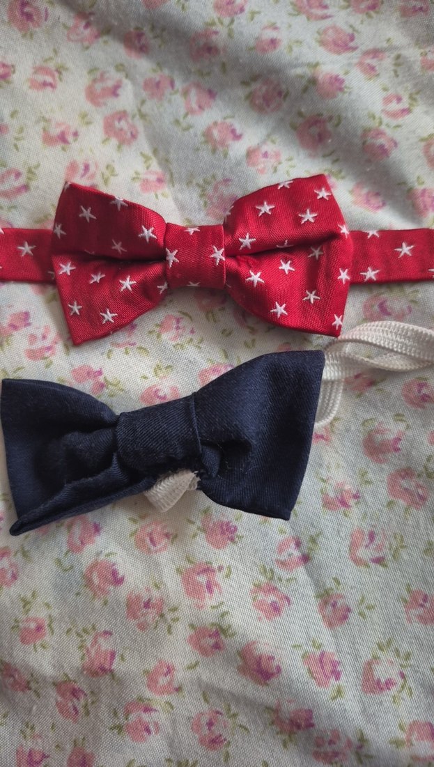 Çocuklar için vintage tarzda, kırmızı yıldız desenli ve sade lacivert olmak üzere iki renkli tekstil papyon seti.