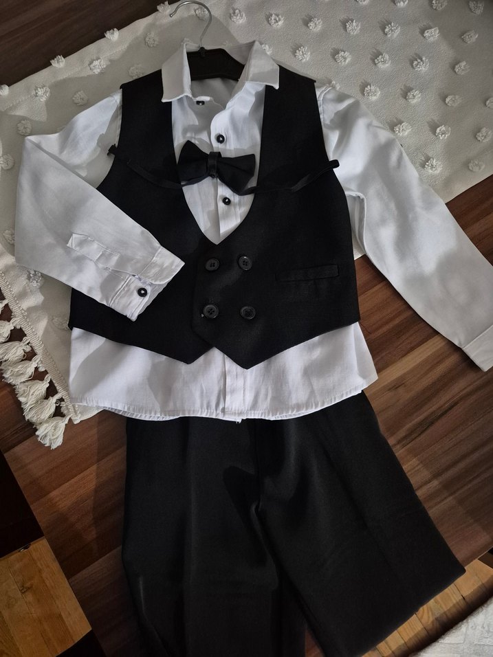 Beyaz düğmeli gömlek, siyah yelek ve uzun pantolondan oluşan çocuk takımı, siyah papyonla tamamlanmış klasik ve gotik tarzda.