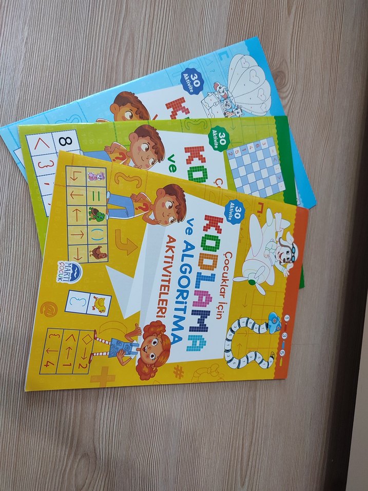 Üç kitaplık set, çocuklar için kodlama ve algoritma aktiviteleri içerir, problem çözme ve mantıksal düşünmeyi destekler. ürünler sıfırdır