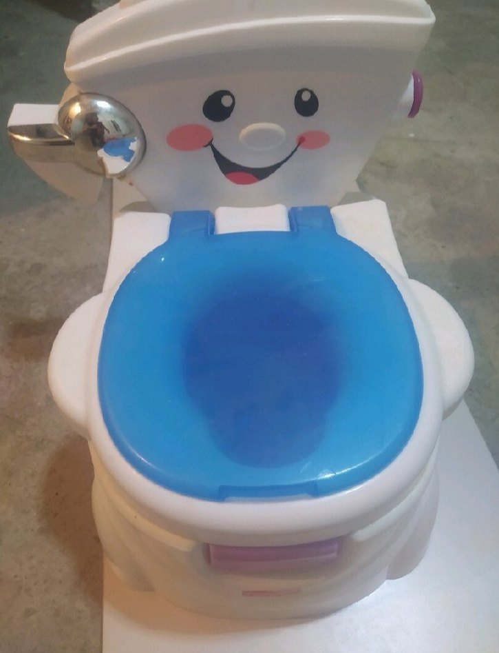 Gülen yüz desenli, mavi oturma kısmına sahip çocuklar için eğlenceli lazımlık. müzikli