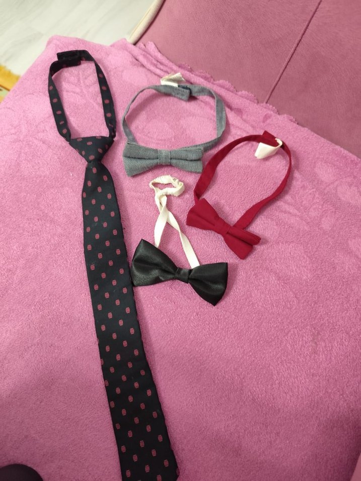 Koyu pembe puantiyeli kravat ve gri, kırmızı, siyah, beyaz renkte sentetik kumaştan 4 papyon içeren gotik tarzda çocuk seti.