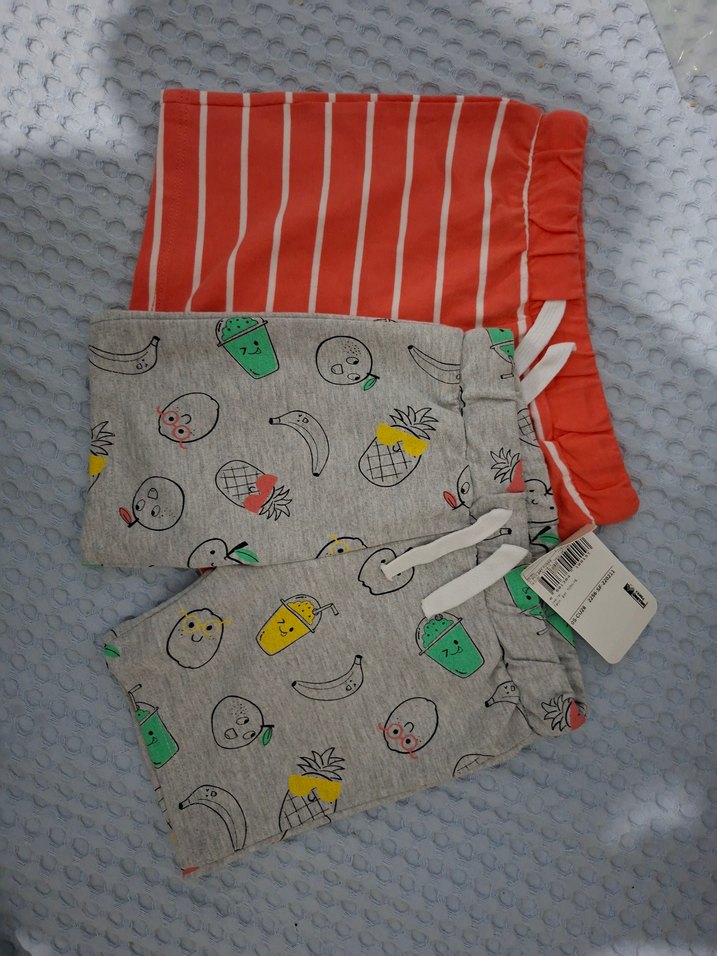 Yumuşak çocuk şortu, renkli meyve desenli ve çizgili. Çocuklar için rahat ve konforlu.