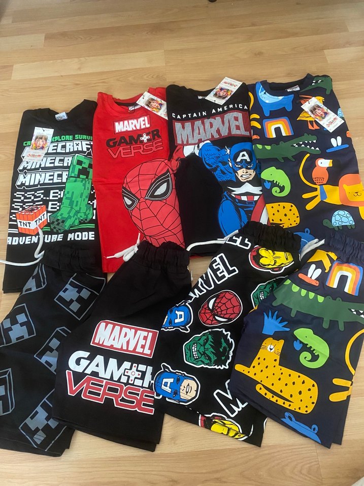 Marvel ve Minecraft baskılı, cırt cırtlı, tekstil malzemeden yapılmış koyu renkli ve çok renkli çocuk kıyafet seti.