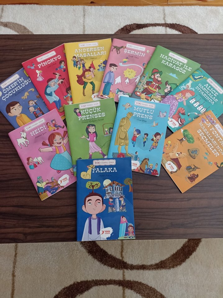 100 temel eserden Pinokyo, Küçük Prenses ve Falaka gibi çeşitli çocuk hikaye kitaplarını içeren renkli bir kitap seti. Her kitap, çocuklar için eğlenceli çizimler ve klasik hikayeler sunar .