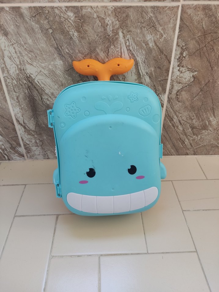 Renkli mavi çocuk oyun çantası, yuvarlak ön yüzü ve turuncu kuyruk tutacağı ile balina tasarımına sahip. Suyla vakit geçirmek isteyenler için ideal