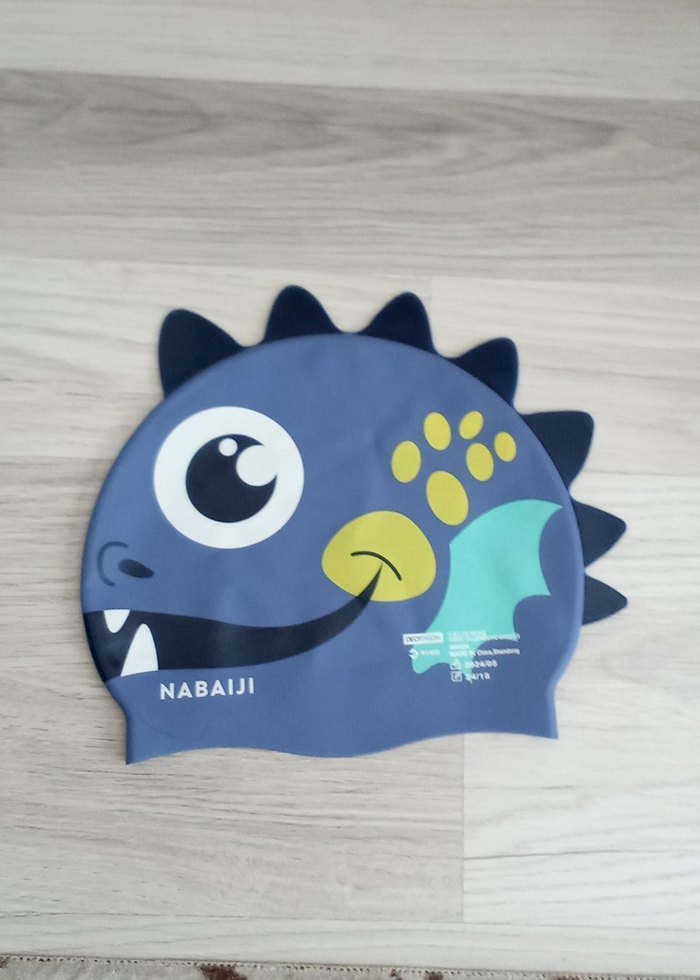 Mavi renkli, dinozor desenli çocuk yüzme bonesi, üzerinde NABAIJI yazısı bulunur.
