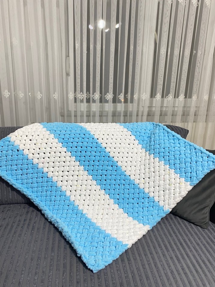 Yumuşak örgü kumaştan, geniş mavi ve beyaz şeritlere sahip çocuklar için örgü battaniye.
