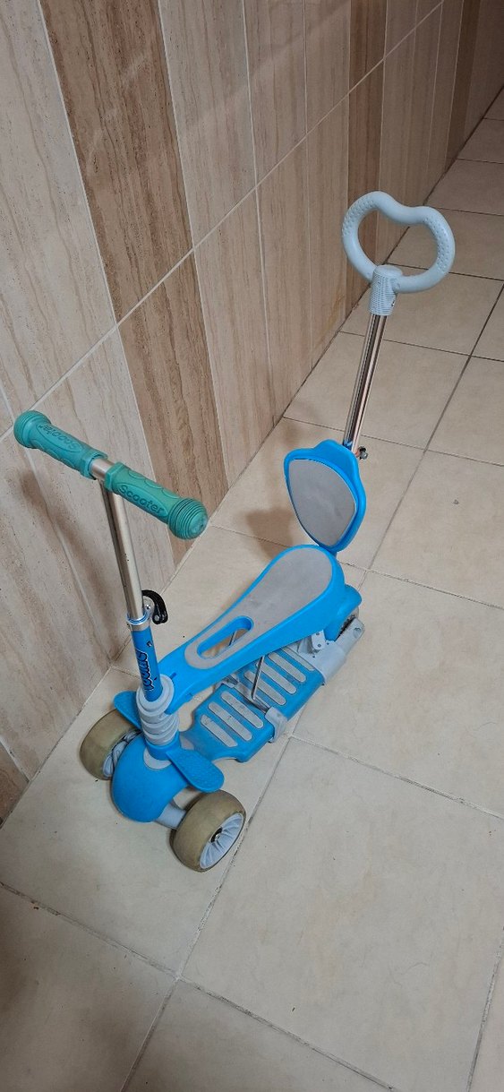 Kolay sürüş için oturaklı ve kalp şeklinde tutamaçlı, renkli mavi çocuk scooterı. scooter oturağını çıkarıp sadece scooter olarakta kullanılıyor sadece tutma yerinde çok tutulduğu için sararma var