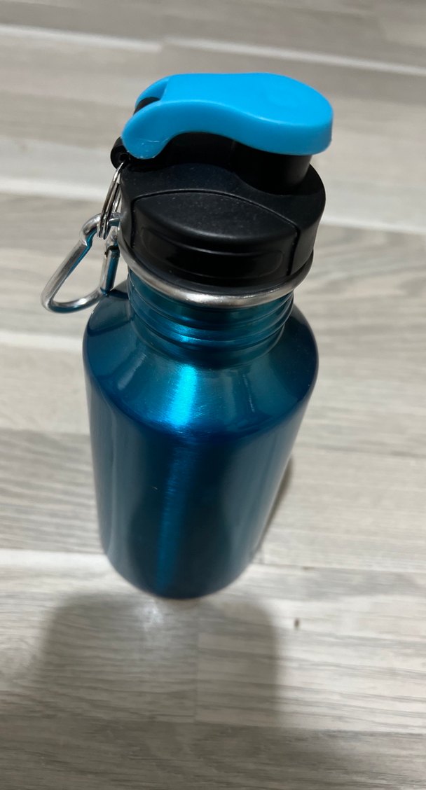 Çocuklar için renkli mavi termos şişe, güvenli açılır kapak ve taşıma için metal klips içerir.