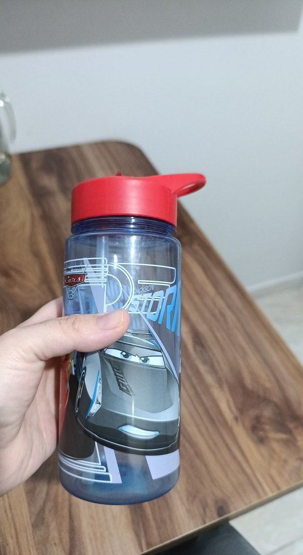 Kırmızı kapaklı, araba desenli mavi çocuk termos şişesi. Hafif ve kolay tutulur. ön kısmında hafif kirilma vardir