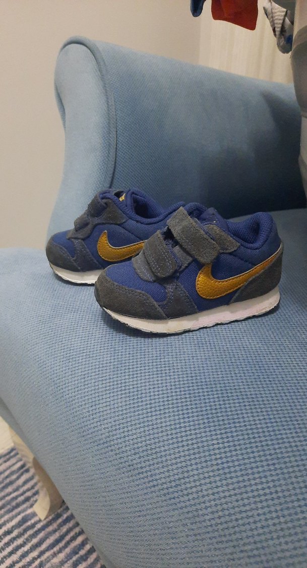 Mavi ve gri renklerde, velcro bantlı, kauçuk tabanlı ve batik desenli çocuk spor ayakkabısı, trend sokak giyimi için uygun.