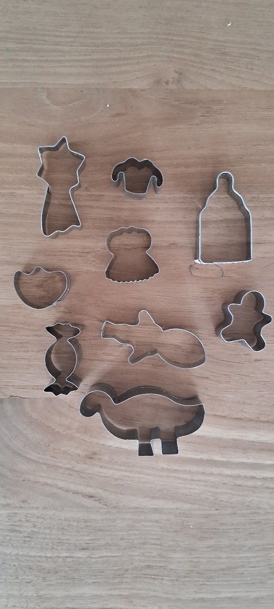 Yıldız değnek, cupcake, biberon, kalp, şeker, uçak, zencefilli adam ve dinozor şekilli metal kurabiye kalıpları seti.