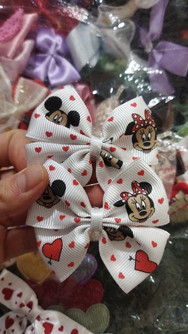 Renkli Minnie ve Mickey Mouse baskılı küçük kırmızı kalplerle süslenmiş fiyonk saç tokaları, çocuklar için uygun. çift 60 tl