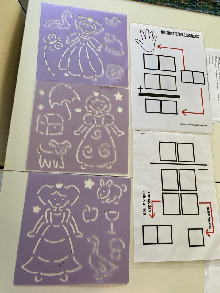 Mor renkte prenses ve hayvan figürlü şablonlar ile birlikte eşleştirme ve izleme etkinlik sayfaları içeren çocuklar için bulmaca seti.